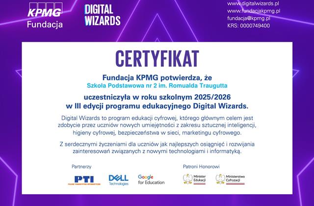Z ogromną dumą informujemy, że troje naszych uczniów: Dominika Popławska z kl. VIII a oraz Ola Zajko i Damian Sitko z kl. VIII b, zakwalifikowało się do II etapu ogólnopolskiego konkursu Digital Wizards, organizowanego przez Fundację KPMG