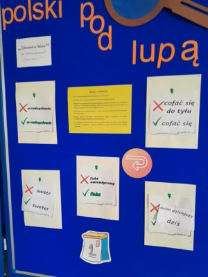 Należy wspomnieć, że już od 20 lutego uczniowie mogli zapoznać się z tematyczną wystawą „Język polski pod lupą”, poświęconą najczęściej popełnianym błędom językowym. Zaprezentowano na niej przykłady niepoprawnych form, takich jak: „swetr”, „włanczać” czy „w każdym bądź razie”. Uczniowie mieli możliwość wybrania siedmiu wyrazów lub zwrotów, a następnie wykorzystania ich w zdaniach we właściwej postaci i przekazania pracy nauczycielowi do oceny. Osoby, które wykonały zadanie bezbłędnie, zostały nagrodzone. Zorganizowana akcja służyła propagowaniu dbałości o język ojczysty, rozwijaniu umiejętności stosowania zasad poprawnościowych, a także kształtowaniu postawy szacunku wobec języka polskiego.